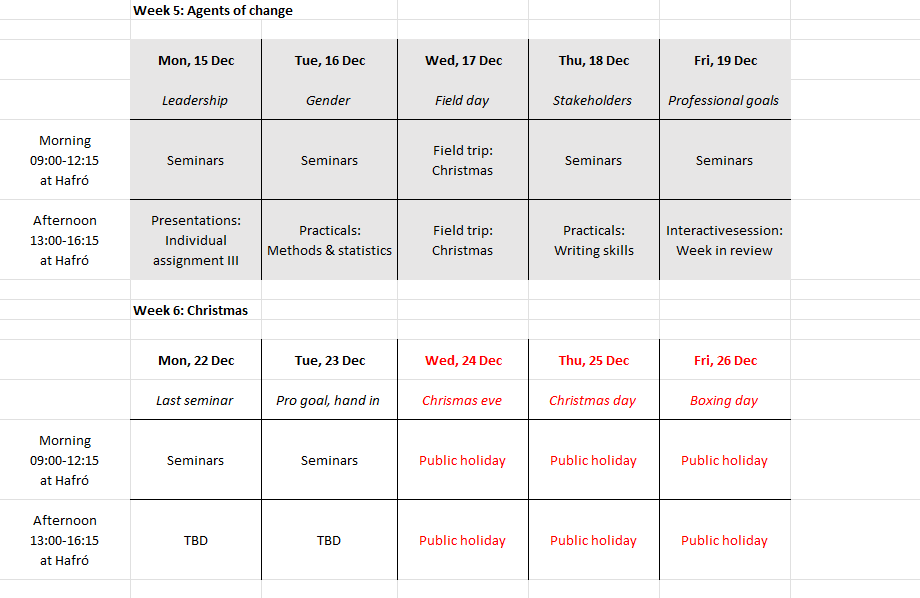 | Fri, 26 Dec | Boxing day | Hand in personl goals to julie@groftp.is |