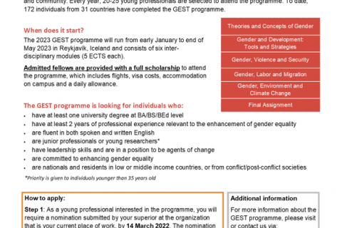 The GRÓ Gender Equality Studies and Training (GRÓ GEST) programme calls for nominations for its academic programme in 2023. The deadline for nominations is 14 March 2022.