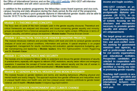 The Lebanese American University (LAU) and UNU-GEST invite master's students to apply for a joint Erasmus+ and UNU-GEST fellowships to attend the 2018 Post-Graduate Diploma Programme in International Gender Studies at the University of Iceland. The programme will run from January 8 to May 24, 2018 in Reykjavík, Iceland.