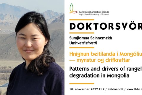 On November 10th Sumjidmaa Sainnemekh will defend her PhD dissertation in the field of environmental sciences at the Faculty of Environmental and Forest Sciences of the Agricultural University of Iceland. Her thesis is titled Patterns and drivers of rangeland degradation in Mongolia.