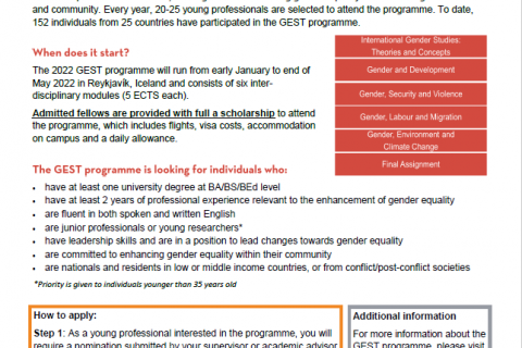 The Gender Equality Studies and Training (GEST) programme has extended its call for nominations for its academic programme in 2022. The deadline for nominations is 15 March 2021.
