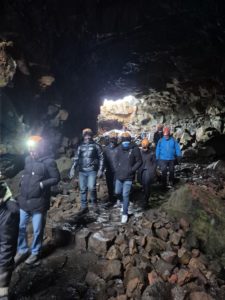 Next, the fellows descended underground into the Lava Tunnel at Raufarhólshellir, one of Iceland’s longest lava tubes. Walking through the colorful rock formations and skylights of this 5,600-year-old cave was nothing short of magical. The illuminated passage revealed the geological wonders created by ancient volcanic eruptions—a memorable moment was when the lights were switched off and the group got to experience absolute blackness and silence – a true highlight of the day!
