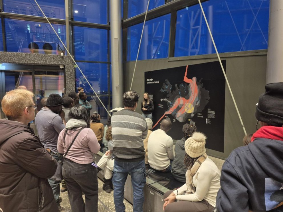 The first stop was the Geothermal Exhibition at Hellisheiðavirkjun, where fellows enjoyed a guided tour showcasing the vital role geothermal energy plays in Icelandic society and industry. From observation decks overlooking pipes, separation tanks, and cooling towers to looking inside high- and low-pressure turbine halls, the group gained a fascinating insight into how this renewable resource powers homes and businesses. Short videos and interactive displays—including the Carbfix room—added to the experience, and our dedicated guide was on hand to answer the fellows̓ questions.