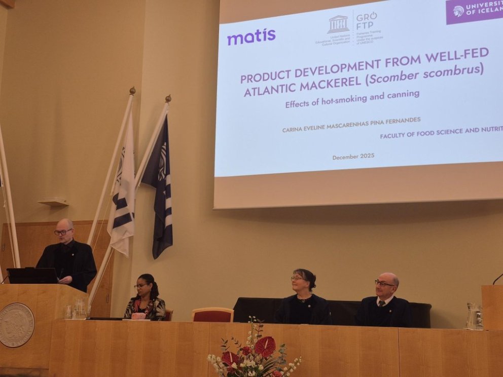 GRÓ Fisheries Training Programme (GRÓ FTP) is delighted to celebrate the achievement of Carina Eveline M. Pina Fernandes, a former fellow (2016) and GRÓ FTP scholarship recipient from the Cabo Verde Islands, who successfully defended her PhD in Food Science at the University of Iceland on December 10, 2025. Her thesis was entitled Product development from well-fed Atlantic mackerel (Scomber scrombus): effects of smoking and canning.