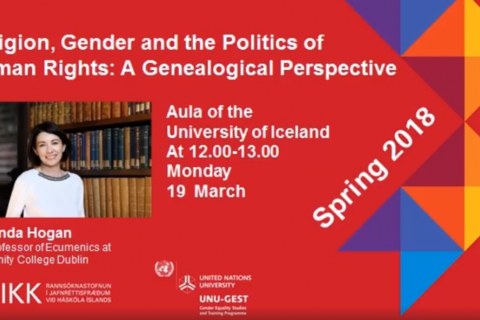 Prof. Linda Hogan, Professor of Ecumenics at Trinity College Dublin, is the sixth lecturer in the joint RIKK and UNU-GEST 2018 spring term lecture series. Her lecture is titled „Religion, Gender and the Politics of Human Rights: A Genealogical Perspective“ and will take place today, March 19th from 12.00-13.00 in the Aula of the University of Iceland.