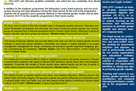 External Academic Relation Office at Birzeit University and UNU-GEST invite master's students to apply for a joint Erasmus+ and UNU-GEST fellowships to attend the 2018 Post-Graduate Diploma Programme in International Gender Studies at the University of Iceland. The programme will run from January 8 to May 24, 2018 in Reykjavík, Iceland.
