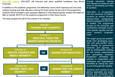 The External Academic Relation Office at Birzeit University and UNU-GEST invite master's students to apply for a joint Erasmus+ and UNU-GEST fellowships to attend the 2019 Post-Graduate Diploma Programme in International Gender Studies at the University of Iceland. The programme will run from January 8 to May 24, 2019 in Reykjavík, Iceland