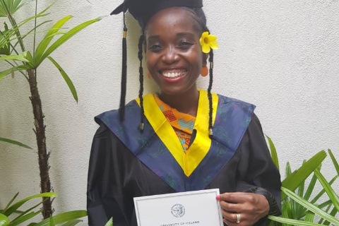 Beatrice Dossah from Ghana and a former GRÓ LRT fellow (2017), graduated in June with an MSc in Environment and Natural Resources from the University of Iceland. After completing her six-month training in Iceland, she was accepted to a master's programme in Environment and Natural Resources, at the University of Iceland, in 2019 and granted a GRÓ LRT scholarship for post-graduate studies in Iceland.