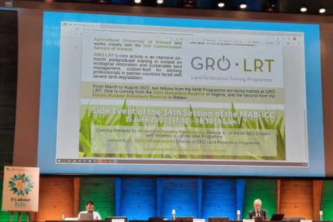 During the 34th Session of the International Co-ordinating Council of the Man and the Biosphere Programme (MAB-ICC) at UNESCO HQ in Paris this week, GRÓ LRT and the MAB secretariat co-hosted a side event titled Linking Knowledge to Action in Ecosystem Restoration: Cooperation between GRÓ LRT and UNSECO-MAB. The event started with opening remarks by Ms. Noëline Raondry Rakotoarisoa, Director a.i. of the SC/EES Division and Secretary of the MAB Programme, followed by a lecture by Dr Sjöfn Vilhelmsdóttir, Director of GRÓ LRT where she talked about Iceland’s experience of carrying out ecosystem restoration work for more than 100 years and the focus in the GRÓ LRT Programme on linking knowledge to action in land restoration and sustainable land management.